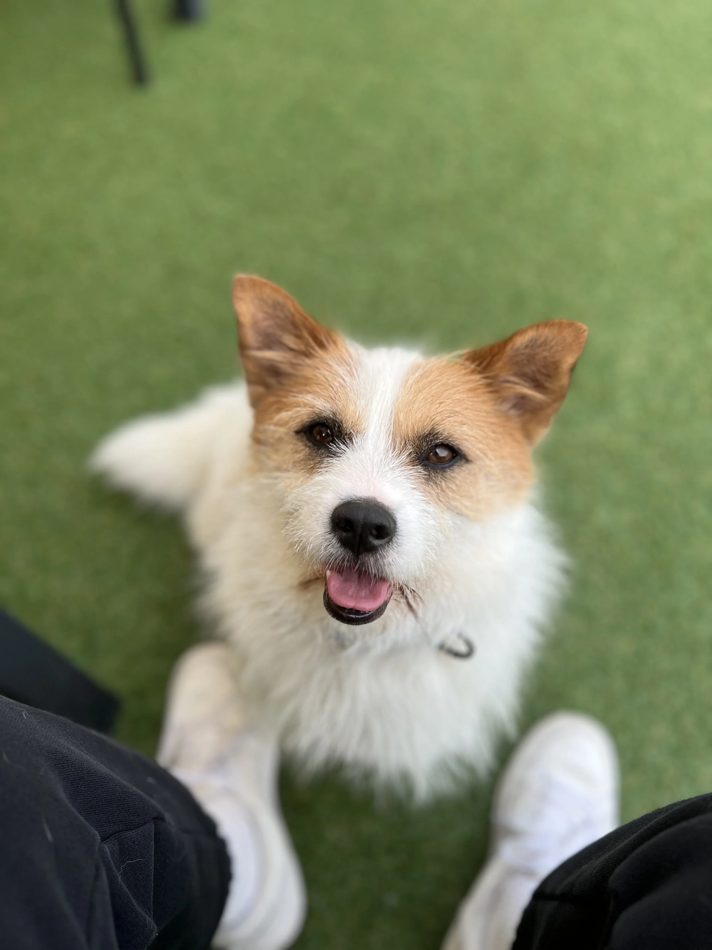 - She is active when playing with the ball and walking outside and usually is very calm, resting beside people.