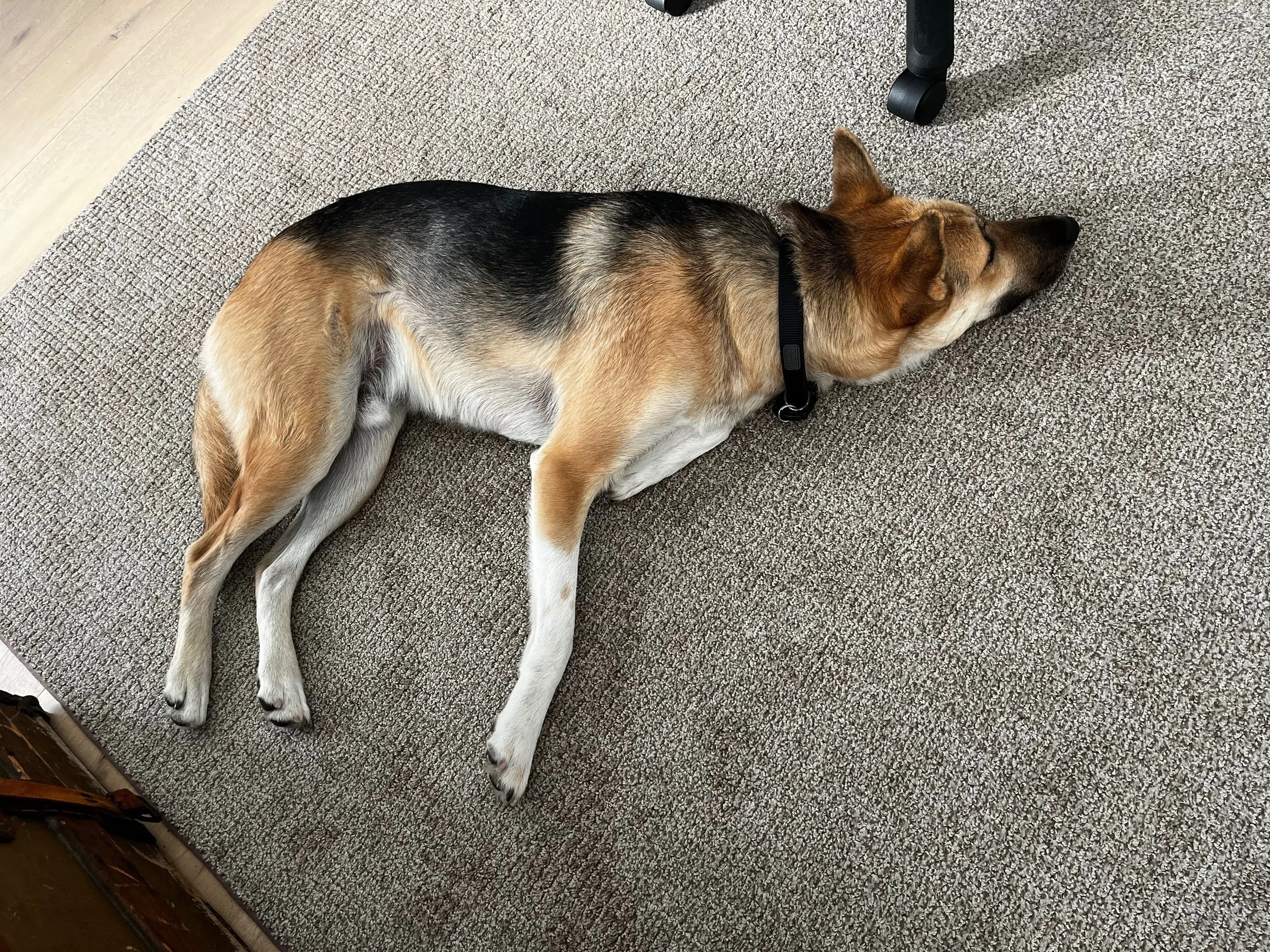 We’ve had Pete home for 3 months now, and we’ve learned that he is extremely laidback, loves people and may have had some training in the past. All he cares about is a tiny spot for him to nap. That’s a big deal for a big dog. We have found him napping in a laundry basket once, the fireplace another time, the bare floor next to his bed. He isn’t a dog who wants much. He’s extremely popular when we go on walks, at work, kids and the extended family. He absolutely adores cats. He loves to snuggle and will hug strangers if they let him. He has a calm and peaceful demeanour.